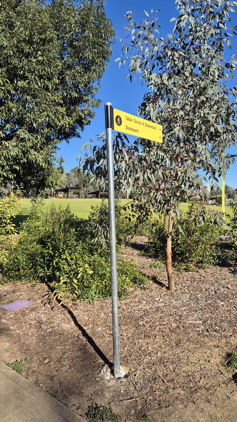 Custom-designed freestanding entry signs and blade signs provide clear, practical navigation throughout the park. The freestanding signs feature a distinctive design element—Burwood Council’s logo expertly formed from rolled flatbar—showcasing our precision metalworking capabilities. Each sign is constructed with a robust aluminium frame, powdercoated for durability and seamlessly integrated with the park’s landscape.